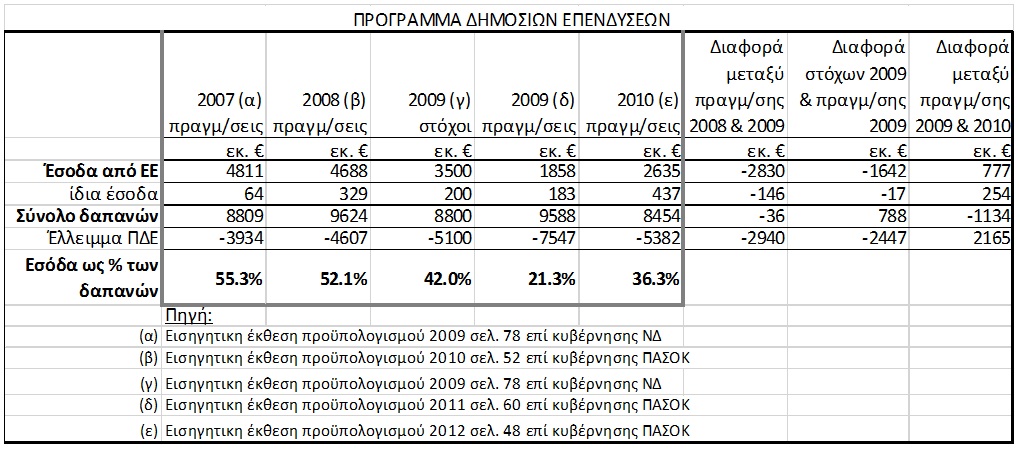 Όπως και να αξιολογήσει κανείς τις κινήσεις εσόδων και δαπανών στο ΠΔΕ, οι μεταθέσεις εσόδων και δαπανών που έγιναν στα έτη 2009 και 2010 «βγάζει μάτι» και αποτελεί απόδειξη ενός κεντρικού σχεδιασμού να φουσκώσει το έλλειμμα του 2009 με κάθε τρόπο.